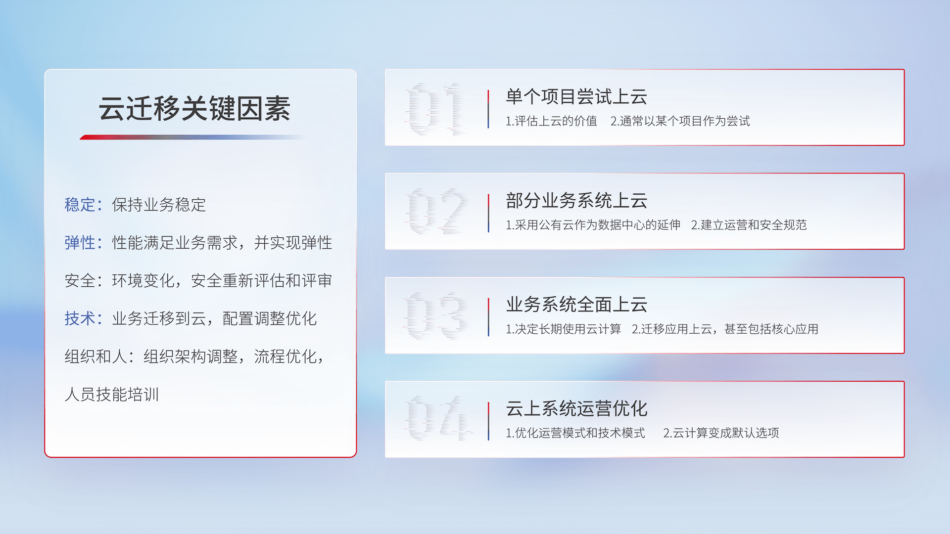 结合实际业务,,,,从规划设计、、、云平台选型、、、、云原生改造、、、数据迁移、、集成交付,,,迁移全过程为客户识别最佳上云路径,,,做好风险识别管理,,,,设计网络架构、、、身份权限、、安全审计合规、、、、操作审计、、、、日志审计、、、、监控告警策略、、、、多站点容灾设计等,,,,对云上基础设施进行整体规划,,,提升IT治理水平,,以满足弹性、、、高可用、、高性能的需求。。。。